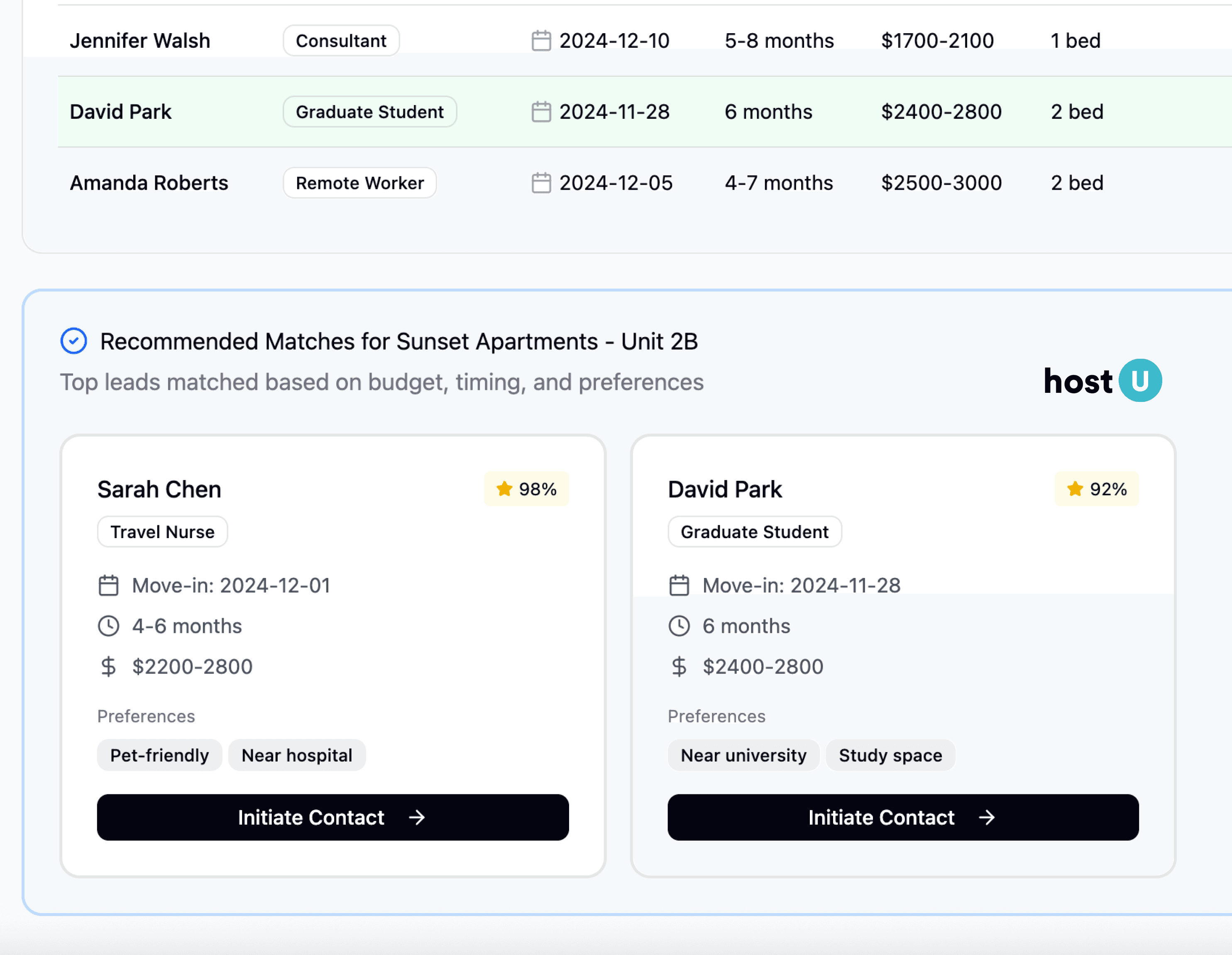 Fill vacant units faster. Hero identifies gaps in occupancy and connects them to vetted, medium-term renters through hostU — helping you turn idle space into steady income with no extra workload.