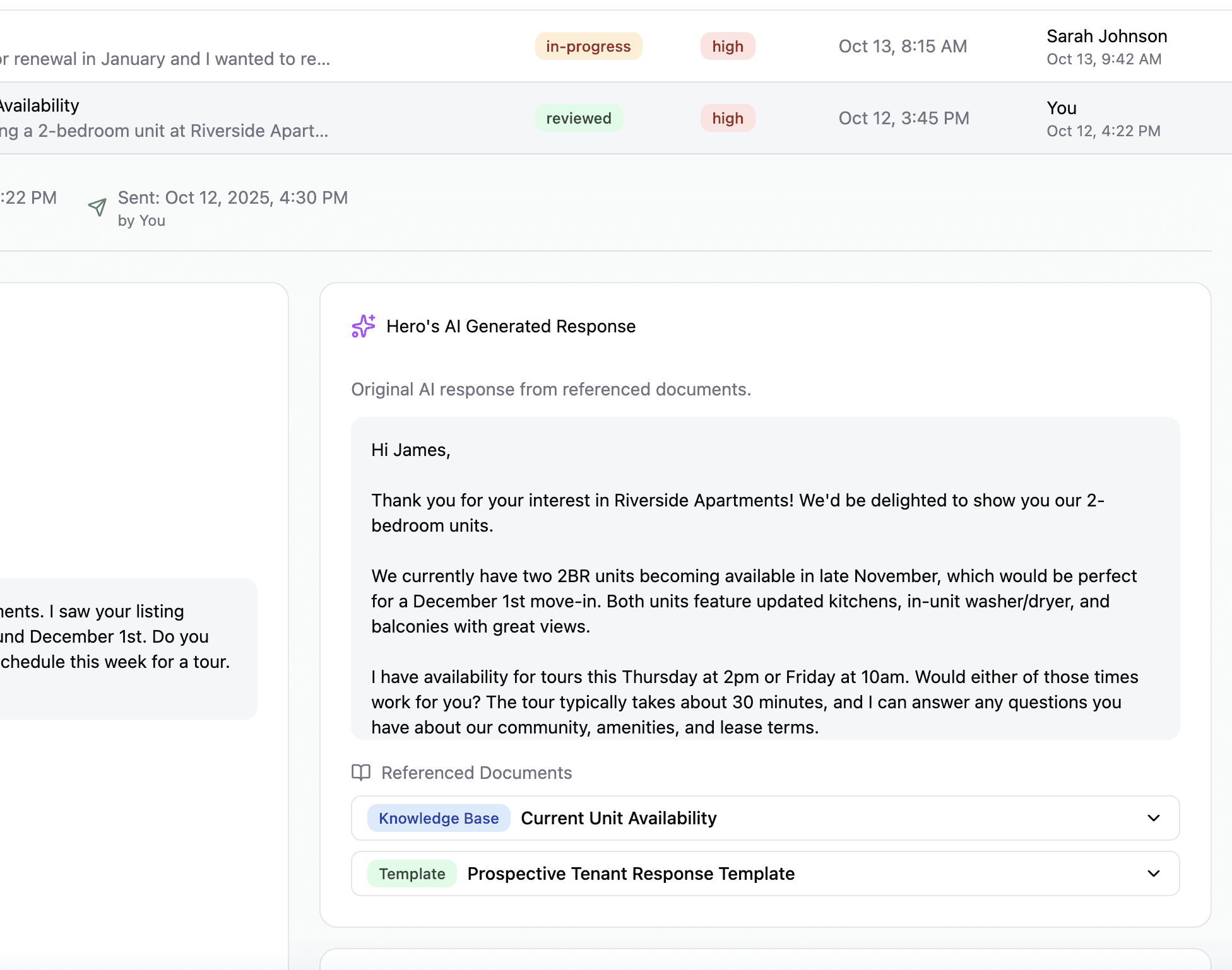 Hero automates outreach and connects available units with qualified renters — keeping your portfolio full without extra effort from your team.